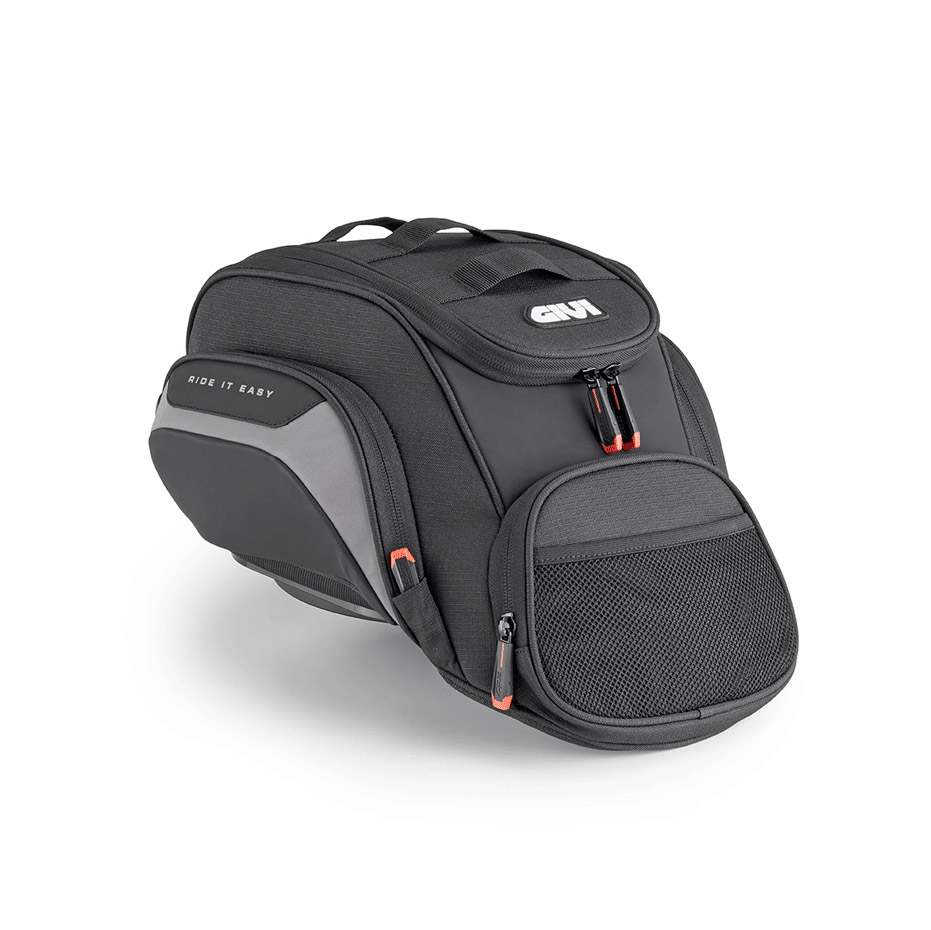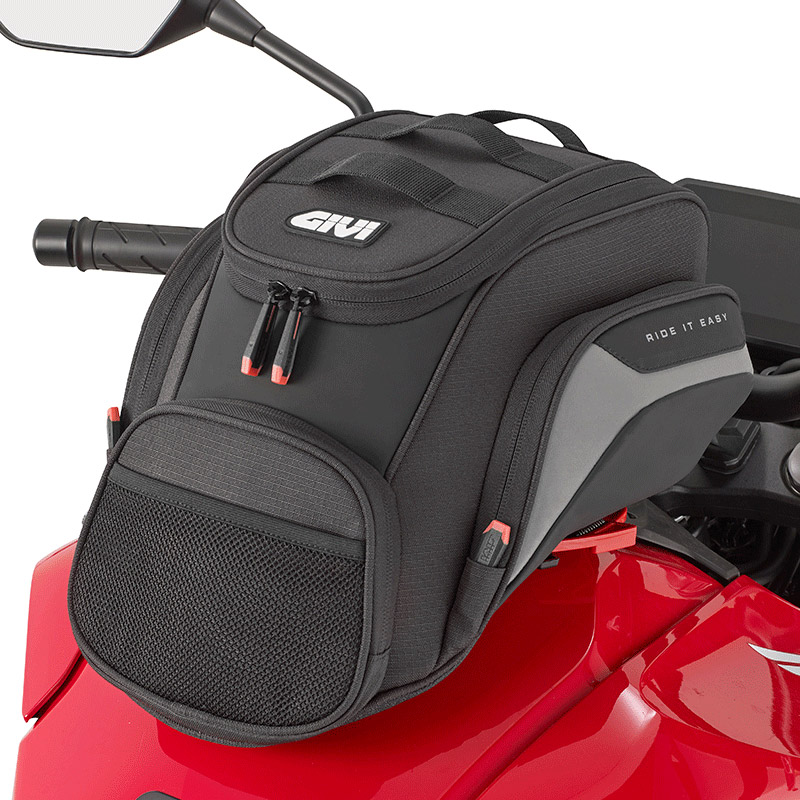 Διαθέτει τρεις διαφορετικές επιλογές τοποθέτησης μέσω του συστήματος Tanklock, ώστε να προσαρμόζεται εύκολα σε διαφορετικούς τύπους ρεζερβουάρ. Οι εξωτερικές θήκες διευκολύνουν την αποθήκευση αντικειμένων που χρειάζεσαι άμεσα, ενώ η ειδική υποδοχή καλωδίου επιτρέπει την ασφαλή χρήση και φόρτιση ηλεκτρονικών συσκευών εν κινήσει.