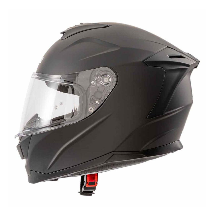 Η αντιχαρακτική ζελατίνα προσφέρει καθαρό οπτικό πεδίο και διαθέτει σύστημα ταχείας αφαίρεσης χωρίς εργαλεία, καθώς και μηχανισμό κλειδώματος για μεγαλύτερη ασφάλεια κατά την οδήγηση. Το κράνος κλείνει με micrometric πόρπη τύπου καστάνιας, προσφέροντας σταθερή εφαρμογή και εύκολη χρήση.