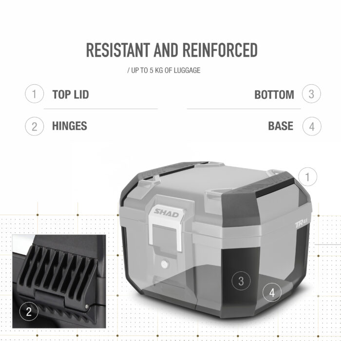 Για την τοποθέτηση απαιτείται η αντίστοιχη πλάκα στήριξης SHAD Top Master (περιλαμβάνεται), η οποία επιτρέπει γρήγορη και ασφαλή στερέωση/αφαίρεση από τη μοτοσυκλέτα